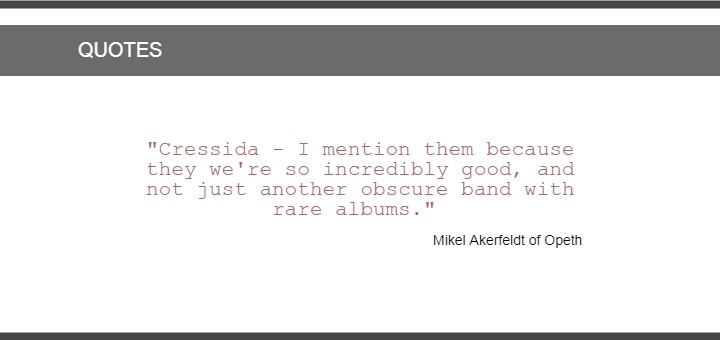 Been a massive fan of Cressida for about 16 years now and have both records on cd and vinyl. Just wanted to pay my respect to the band who have influenced me a lot for my own writing in my band Opeth. Always wondered what the guys are doing now and I was very happy to find this website with pictures I’ve never seen and interviews with everyone. I have been plugging Cressida throughout my entire career and I will never stop doing so.”