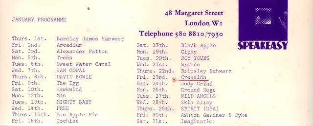Throughout the summer of 1969, the band continued playing the London clubs like the Speakeasy and the Revolution. These were late-night, members-only clubs – regular haunts for musicians and music business folk. Cressida, along with groups such as Mott the Hoople, East of Eden, Man, Ashton Gardner & Dyke, and Barclay James Harvest appeared regularly at these venues, playing for fellow musicians and record company executives who would drop in.